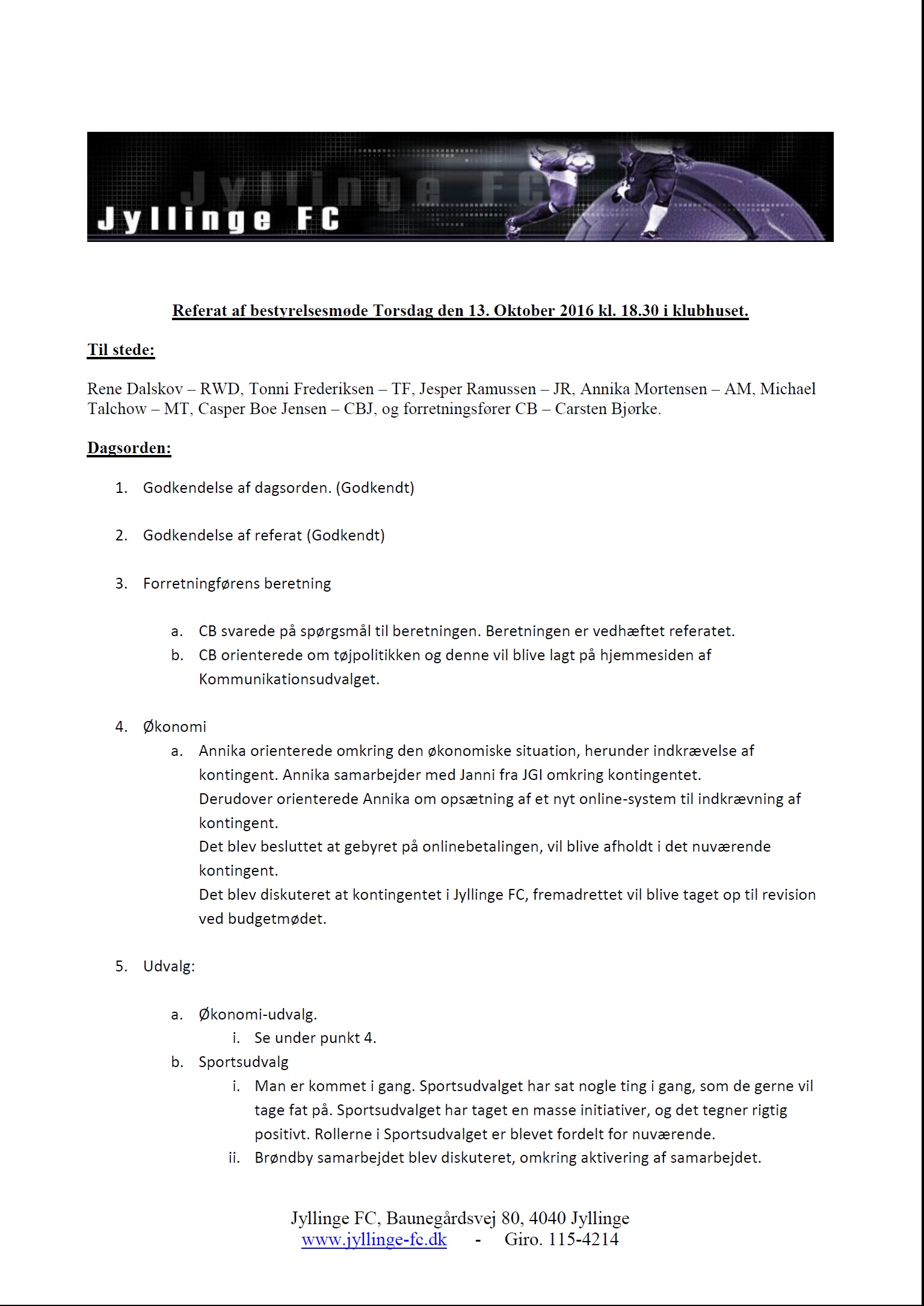 Bestyrelsesmøde den 13 oktober 2016